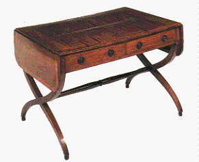 Sofa table: First made in about 1790, and developed from the Pembroke table, this drop leaf table was designed to sit behind a sofa (hence its name, of course), and is long and thin, with two short drop-leaves at each end, and usually two drawers in the frieze. The best ones have two end-supports connected by a stretcher; the single pedestal type is much less desirable. [picture]