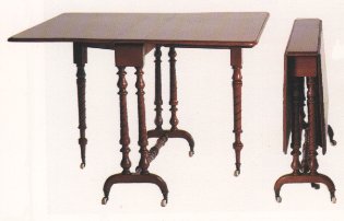 Sutherland table: A form of dropleaf table which has a top that is so shallow as to be almost useless as a functional table, at least until the flaps are extended, and which typically sits atop end columns joined by a central stretcher. First recorded in about 1850, almost exactly 100 years after the similar Pembroke was first made, they were named after Harriet, the Duchess of Pembroke, and reached their height of popularity in the late C19th. [picture]